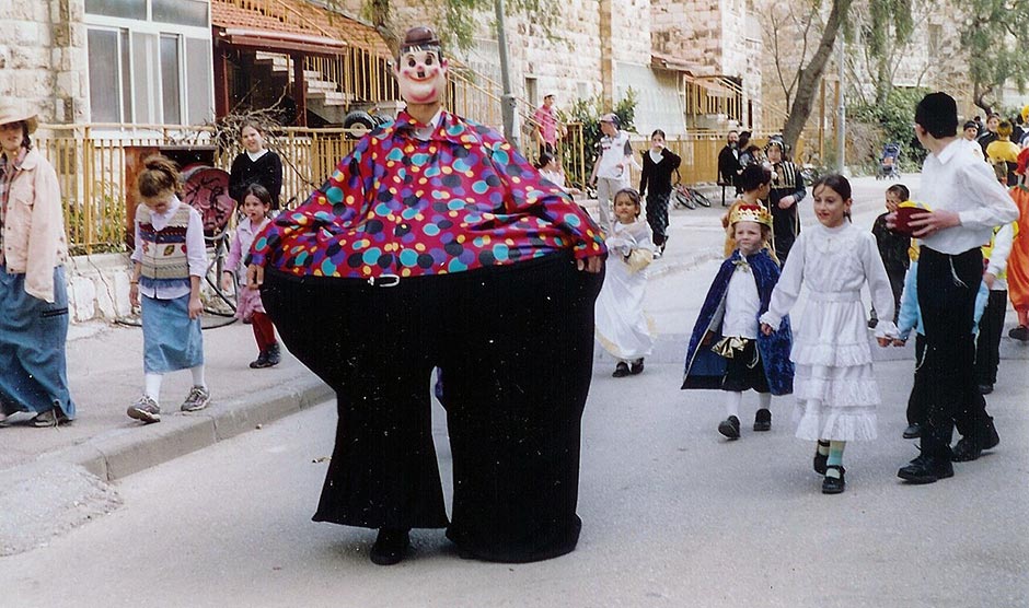 Children dressed in costume and carrying mishloach manot follow a costumed clown on Purim day in Jerusalem, Israel. Photo — Yoninah, Wikimedia, CC BY-SA 3.0