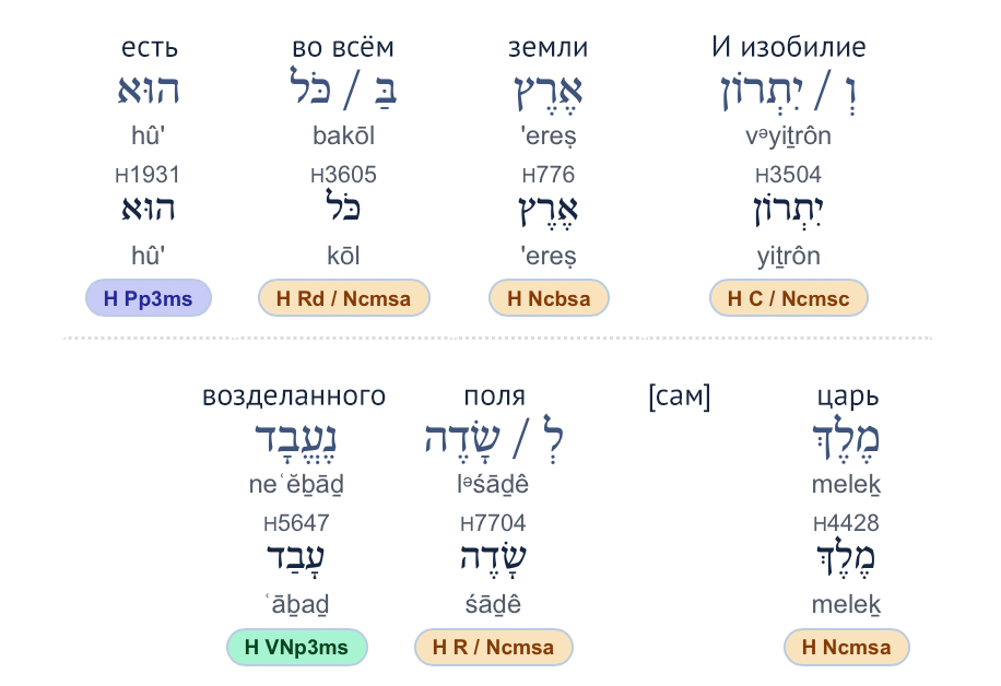 Вот перевод Екклесиаста 5:9 (8) слово в слово из подстрочника (помните, что читать нужно справа налево!):